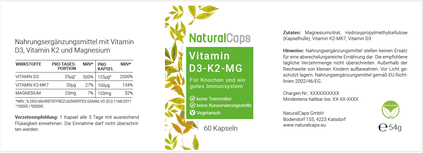 - 125µg D3 + 100µg K2 + 120mg MG pro Kapsel