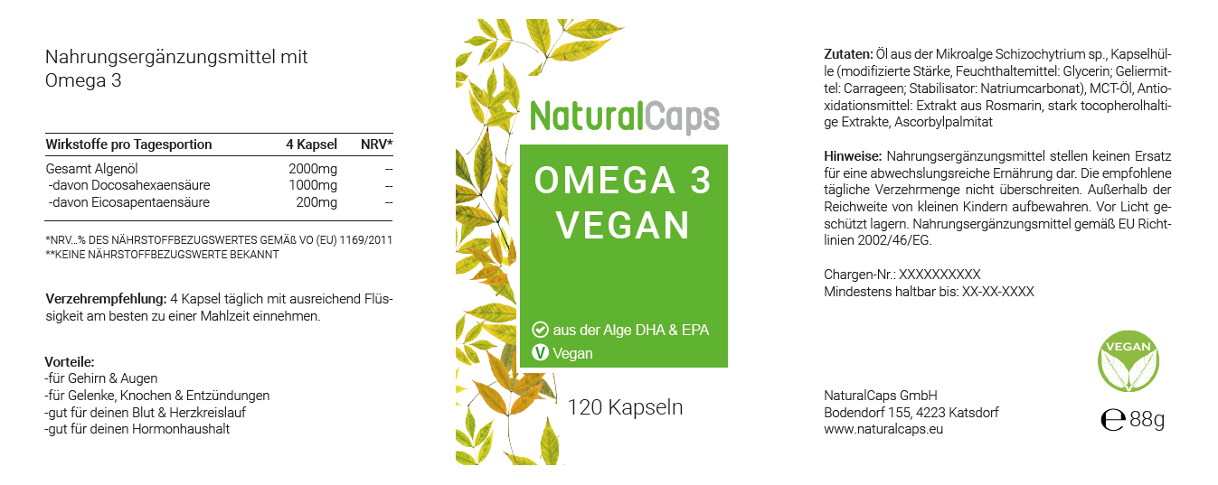 Algenöl (DHA- und EPA-reiches Öl aus der Mikroalge Schizochytrium sp.,) Kapselhülle: Modifizierte Stärke; Feuchthaltemittel: Glycerin; Gereinigtes Wasser; Antioxidationsmittel: Rosmarin-Extrakt, stark tocopherolhaltige Extrakte