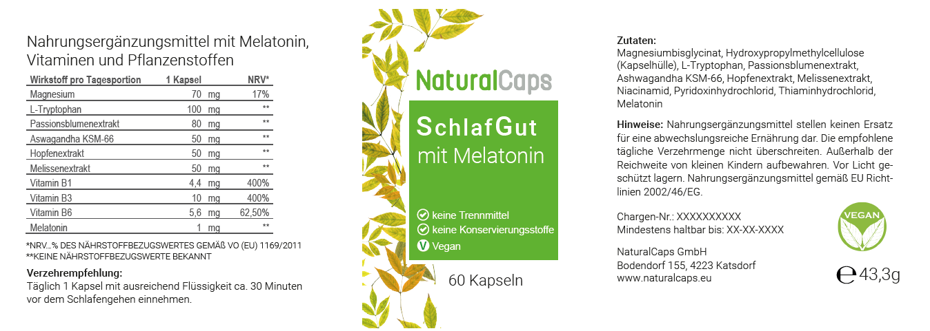 Magnesiumbisglycinat, Hydroxypropylmethylcellulose (Kapselhülle), L-Tryptophan, Passionsblumenextrakt, Ashwagandha KSM-66, Hopfenextrakt, Melissenextrakt, Niacinamid, Pyridoxinhydrochlorid, Thiaminhydrochlorid, Melatonin