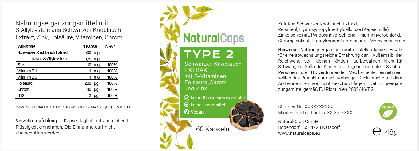 Zutaten: Schwarzer Knoblauch Extrakt, Reismehl, Hydroxypropylmethylcellulose (Kapselhülle), Zinkbisglycinat, Pyridoxinhydrochlorid, Thiaminhydrochlorid, Chrompicolinat, Pteroylmonoglutaminsäure, Methylcobalamin.