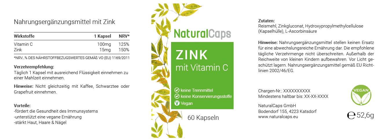 Reismehl, Zinkgluconat, Hydroxypropylmethylcellulose (Kapselhülle), L-Ascorbinsäure